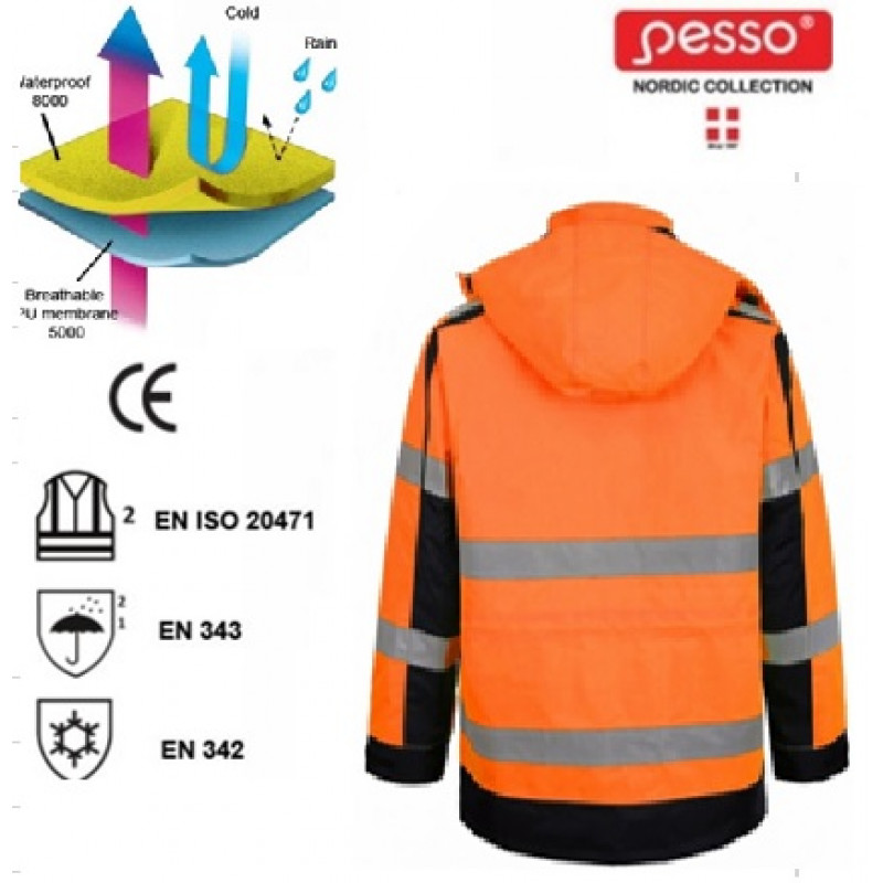 ūdensnecaurlaidīga, elpojoša, augstas redzamības brīdinājuma jaka.