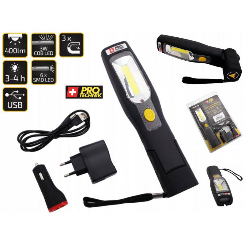 Spēcīga Pro-Technik COB LED lampa. Lukturis darbojas bez vadiem, ērtībai tas ir aprīkots ar trim magnētiem un diviem rotējošiem āķiem, kas ļauj lampu uzstādīt jebkurā vietā.